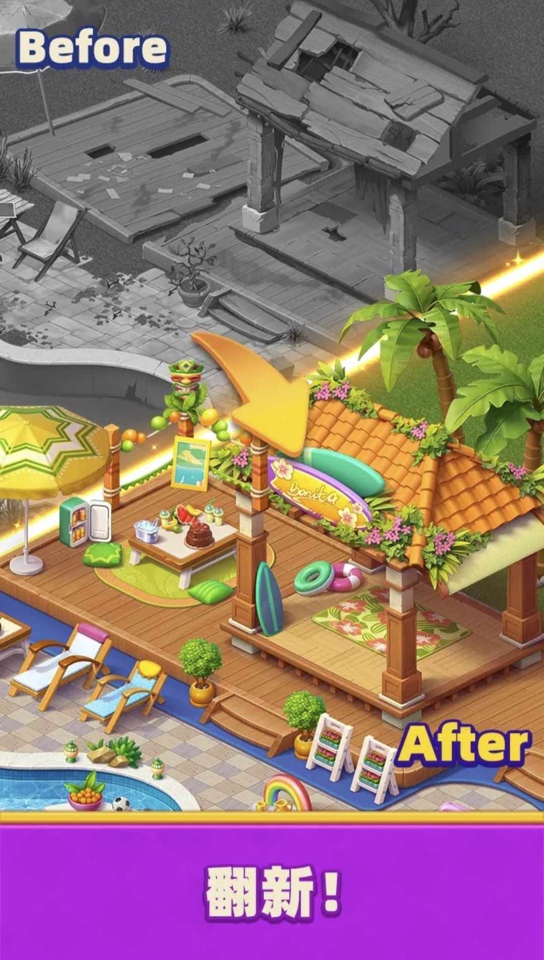 欢迎来到梦幻度假村,这里是益智游戏的天堂!轻扫颜色,解决匹配-3谜题。一场激动人心的冒险正在召唤你!只要你玩过,你就会每天都来 Dream Resort!
