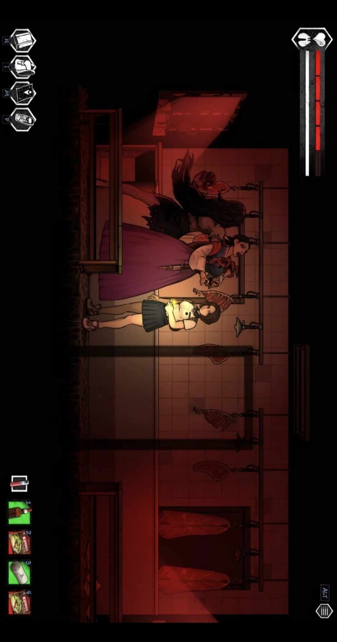 被迫面对无情噩梦的女主人公很难在每次遭遇中毫发无损的逃脱。随着故事的前进,美娜将会遭遇到各种导致她受到永久伤害的重伤。要想避免这样的情况发生,必须仔细寻找场景,收集物品并制作能够回避危险的道具。