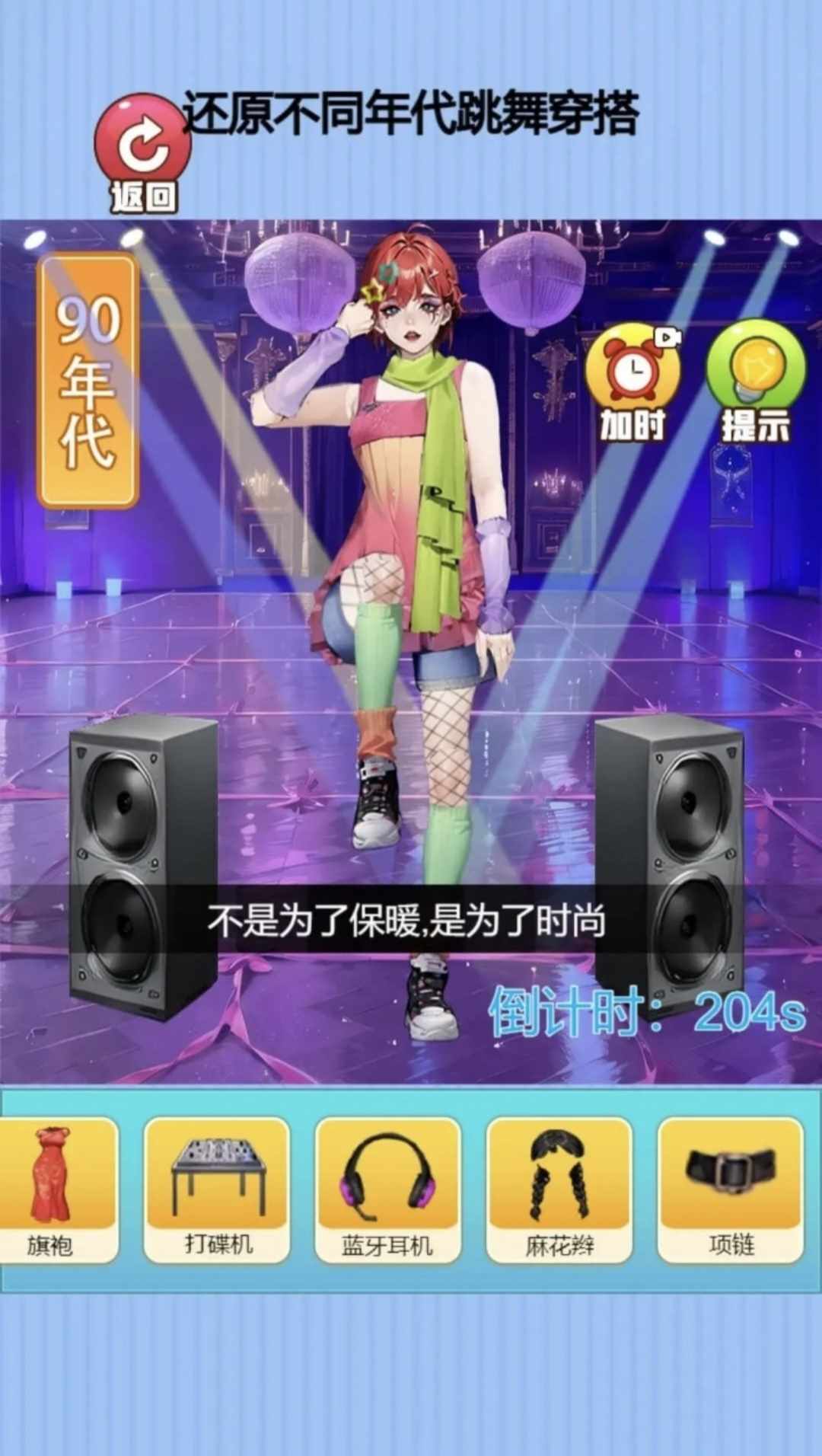 这是一款2D休闲益智游戏,游戏中玩家需要点击屏幕中游戏场景下方的道具栏中的不同服饰,来进行搭配游戏场景中不同年代人们跳舞时候的穿衣搭配,如果在规定时间内完不成不同年代的服装搭配则游戏失败。而玩家可以通过该游戏的提示和答案来快速通关。让我们一起来体验一下吧!