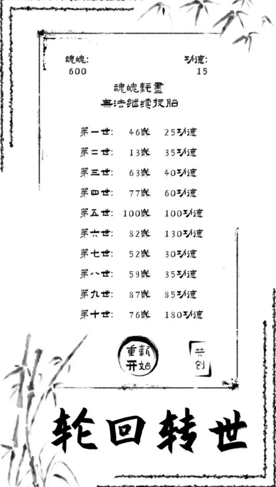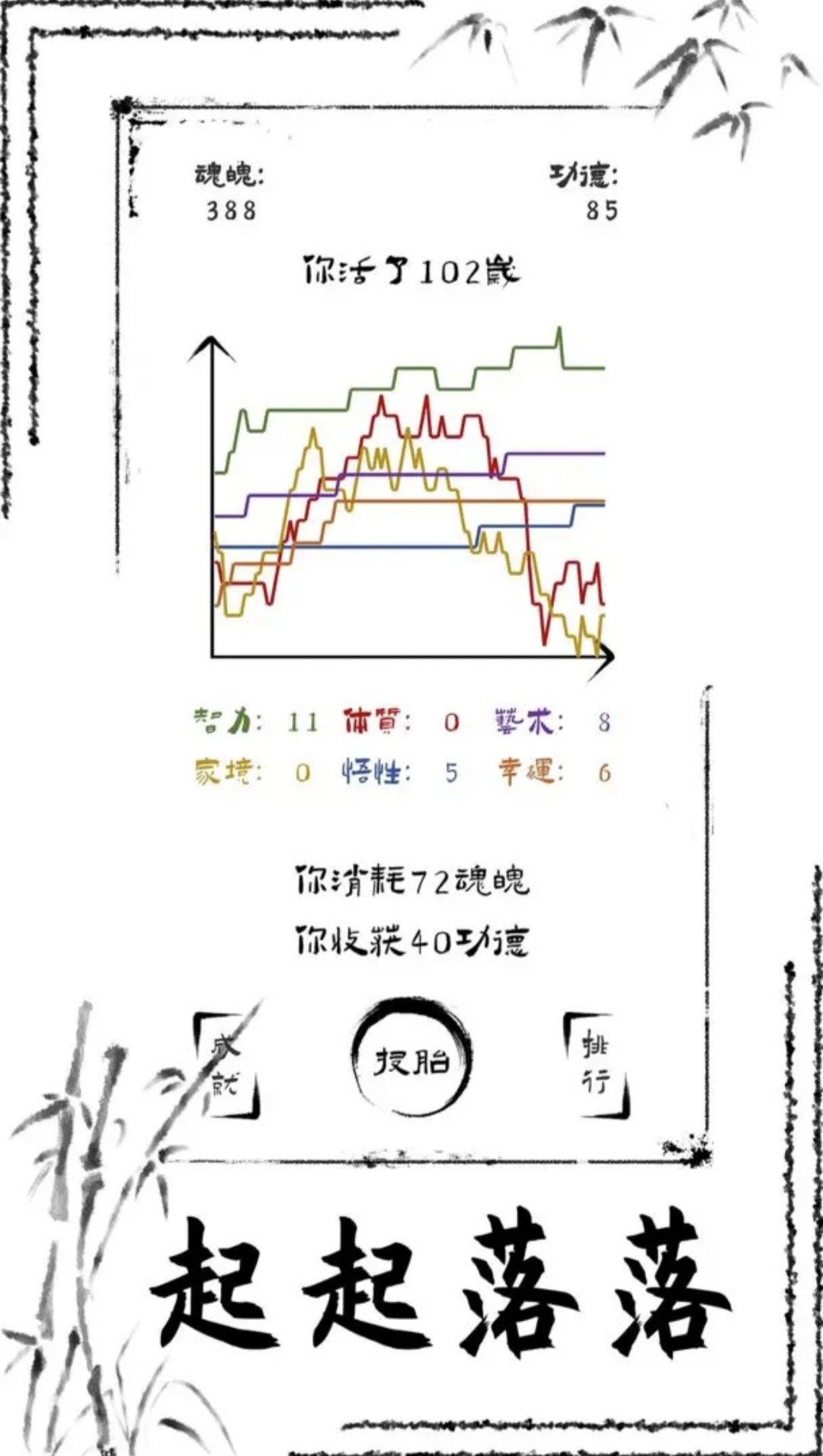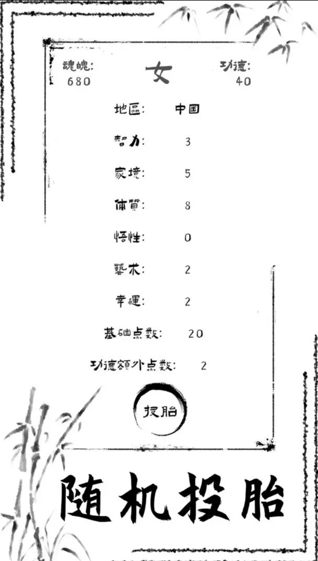 俗话说的好,投胎是个技术活儿。通过转世轮回,在每一年的人生事件中做出自己的选择,不断积攒功德,可以获得更多的投胎点数,增加自己出生时的智力、体质、艺术、幸运、悟性或家境。所以,第一次投胎时由于缺少功德,肯定有诸多困难。但当你轮回次数够多后,人生就会如开挂一般。智力高可以走上科研路线;体质高可以当运动员并获得更长的寿命;艺术高可以当网红、演员、艺术家;幸运高可以遇到各种奇遇或者走上创业道路;悟性高可以体悟人生,锻炼魂魄;家境好可以搞投资或者花钱换其他属性。每条路线都有独特的获取功德的方式,需要根据自己投胎后的初始属性分配情况选择合适的路线,争取在每一世获得尽可能多的功德,为下一世铺平道路。最终,在魂魄耗尽前,积攒足够的功德,冲上功德榜。