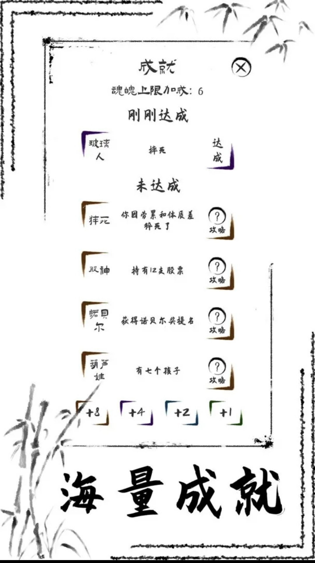 为了让每个属性都有专常,游戏内包含多条道路,分别通向诺贝尔、雨果奖、百万粉丝、奥运冠军、股神、悟道等多个人生终点,与之相伴的有超过一百个不同的成就,指引你走向人生巅峰。