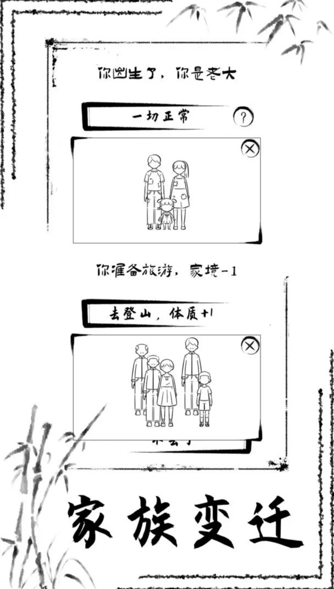 玩家还可以:1、通过共创界面参与到游戏的制作和更新过程之中,说不定就能在游戏中看到自己创造的独特事件;2、通过全家福记录每一年的家族变化;3、通过结算界面的折线图查看人生的起起落落。