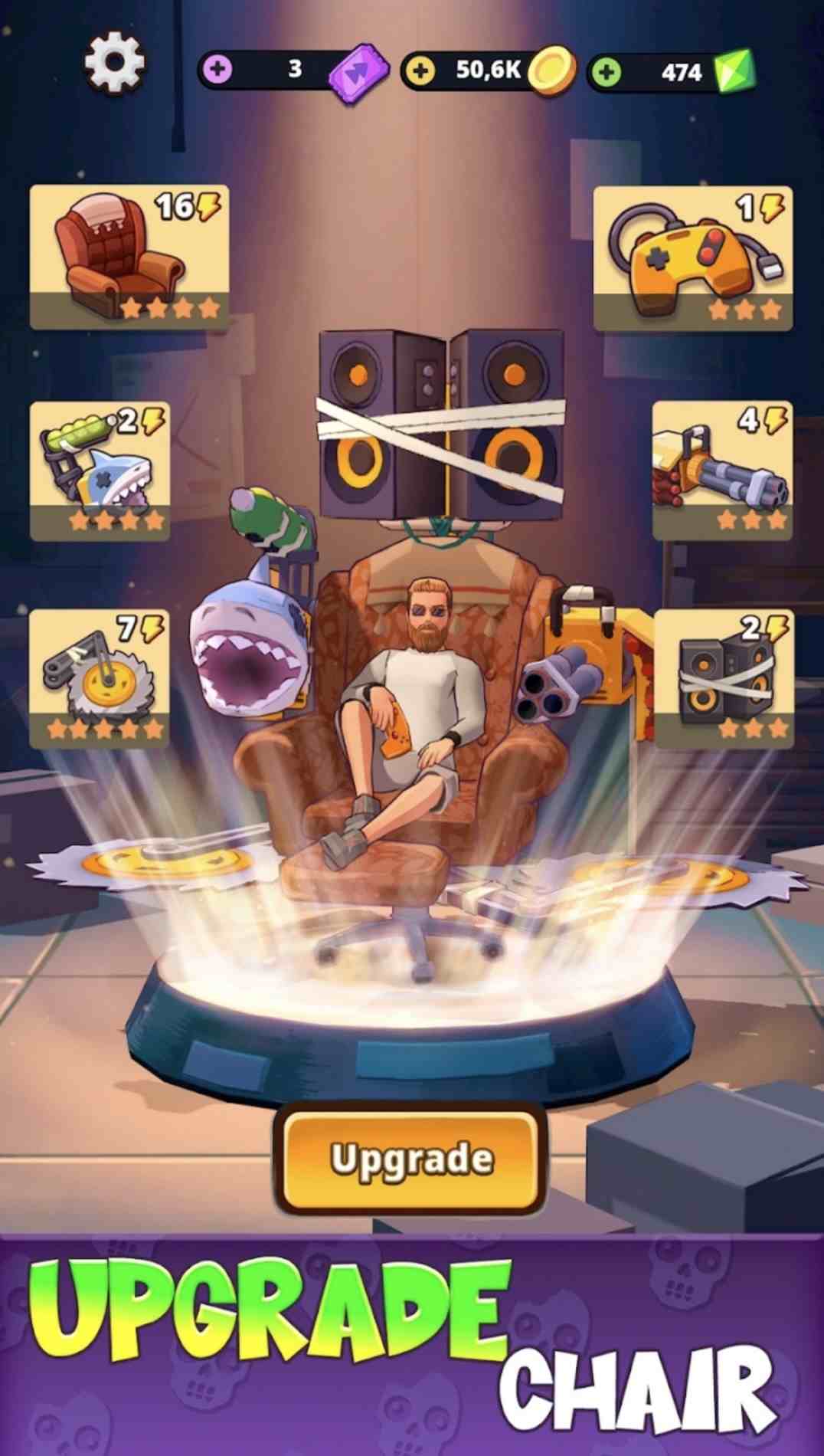 • 升级你的闲置扶手椅:从一个只有一个枪槽的简单凳子开始。直播并获得订阅者,他们将使您有机会升级您的扶手椅及其枪z,将其变成战场上对抗僵尸的强大机甲。