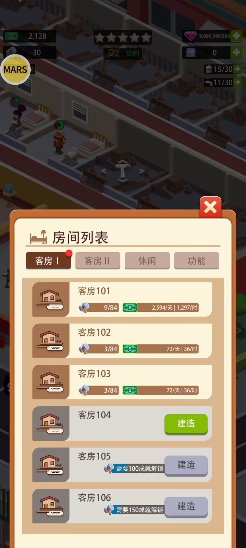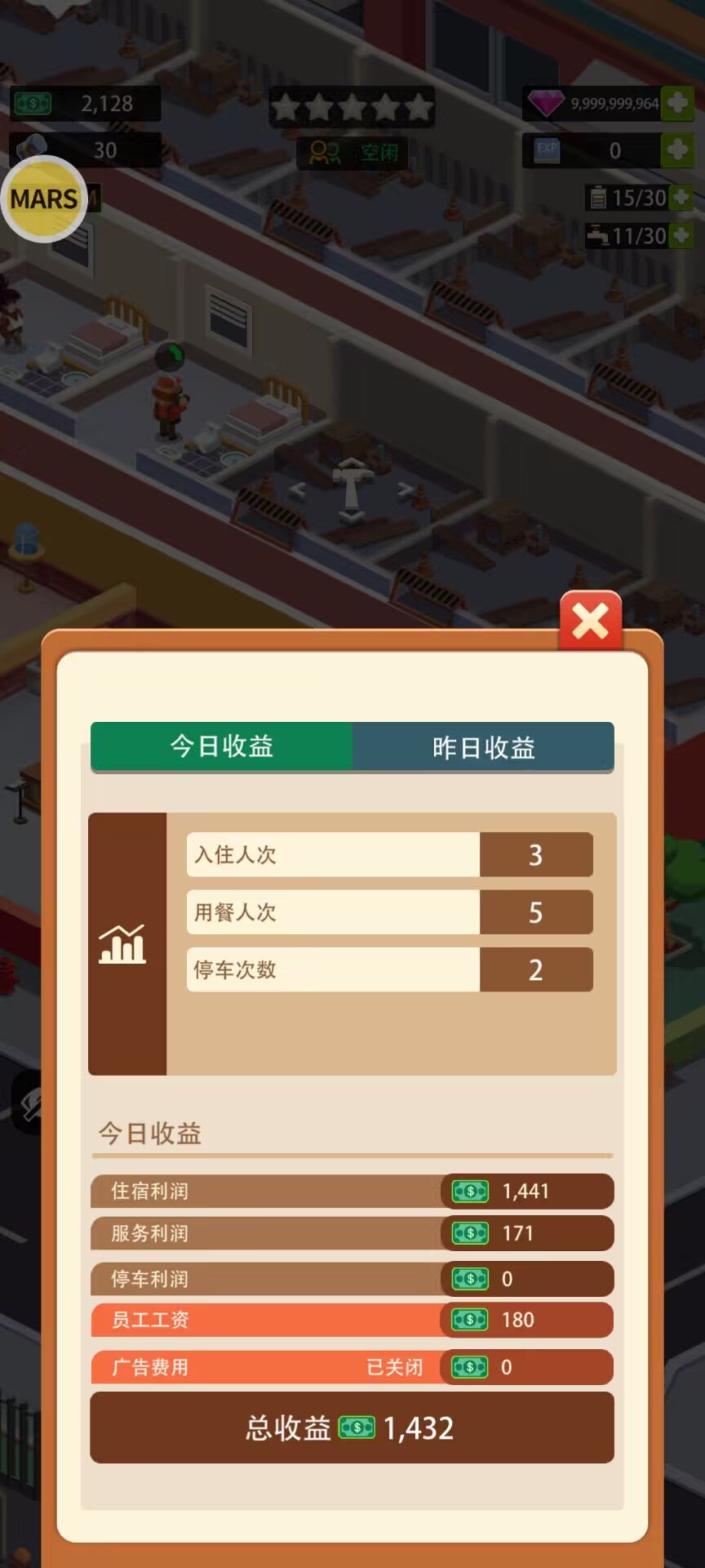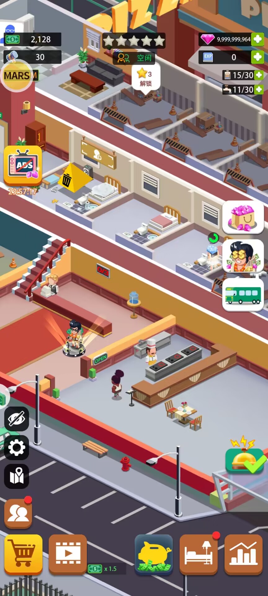 您是大亨游戏玩家吗?您准备好尝试成为酒店经理了吗?发挥您的聪明才智,仔细分配预算,管理收入和支出以获利,逐步积累财富,最终建立酒店帝国,成为度假酒店大亨。 游戏特色: 1. 游戏场景精致的酒店游戏。场景将在白天和黑夜之间变化。 2. 有趣的角色:随着您酒店的知名度不断提高,越来越多的个性化客人将访问您的酒店。不要闲着,将您赚到的所有钱都投入到设施建设中,以便为客人提供更好的服务。当客人的满意度达到一定水平时,会有惊喜等着你。 3. 大量的度假设施等待建设:酒店游戏的一大重点是建设和升级设施。酒店的发展与各种娱乐设施的建设密不可分。升级这些设施,使它们越来越豪华,不仅可以为您带来更多的钱,还可以让您的客人感到高兴。当设施足够、豪华时,您将拥有一个酒店帝国。 4. 当您处于离线状态时,酒店仍然可以为您赚钱,因此不要忘记不时打开游戏以领取它。 如果你喜欢大亨游戏和酒店游戏,千万不要错过《闲置度假村大亨》。