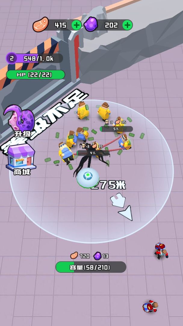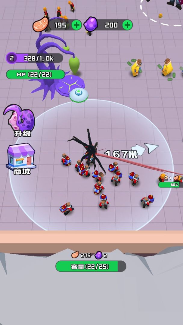 这是一款3D休闲益智游戏,游戏中你需要滑动屏幕控制外星生物角色移动,通过吞噬来获得各种各样的资源,玩家还可以将获得的资源用在农场和雇佣商店上,可以提升玩家资源的收益,游戏关卡中还可以升级玩家和雇佣无人机的属性,该游戏还有更多好玩的关卡供玩家挑战,让我们一起来体验一下吧!
