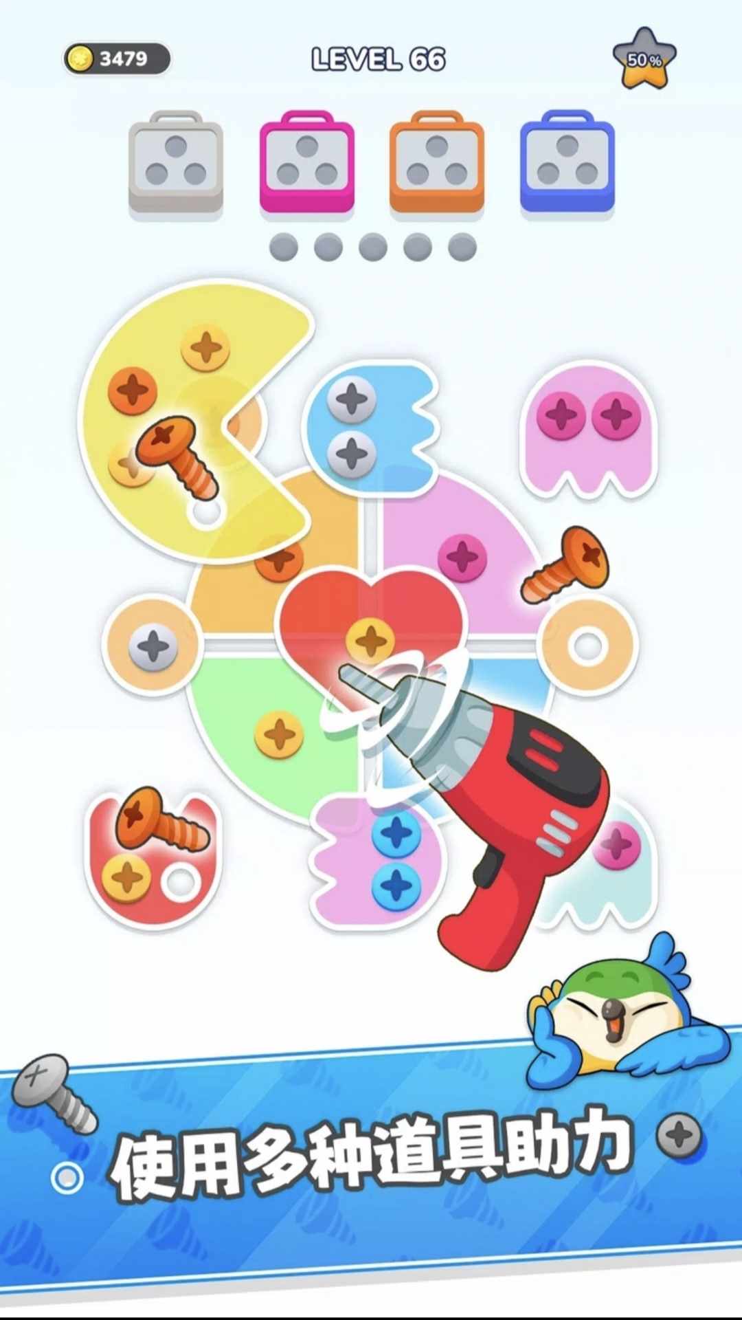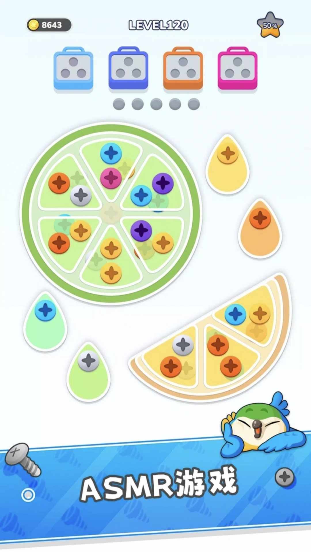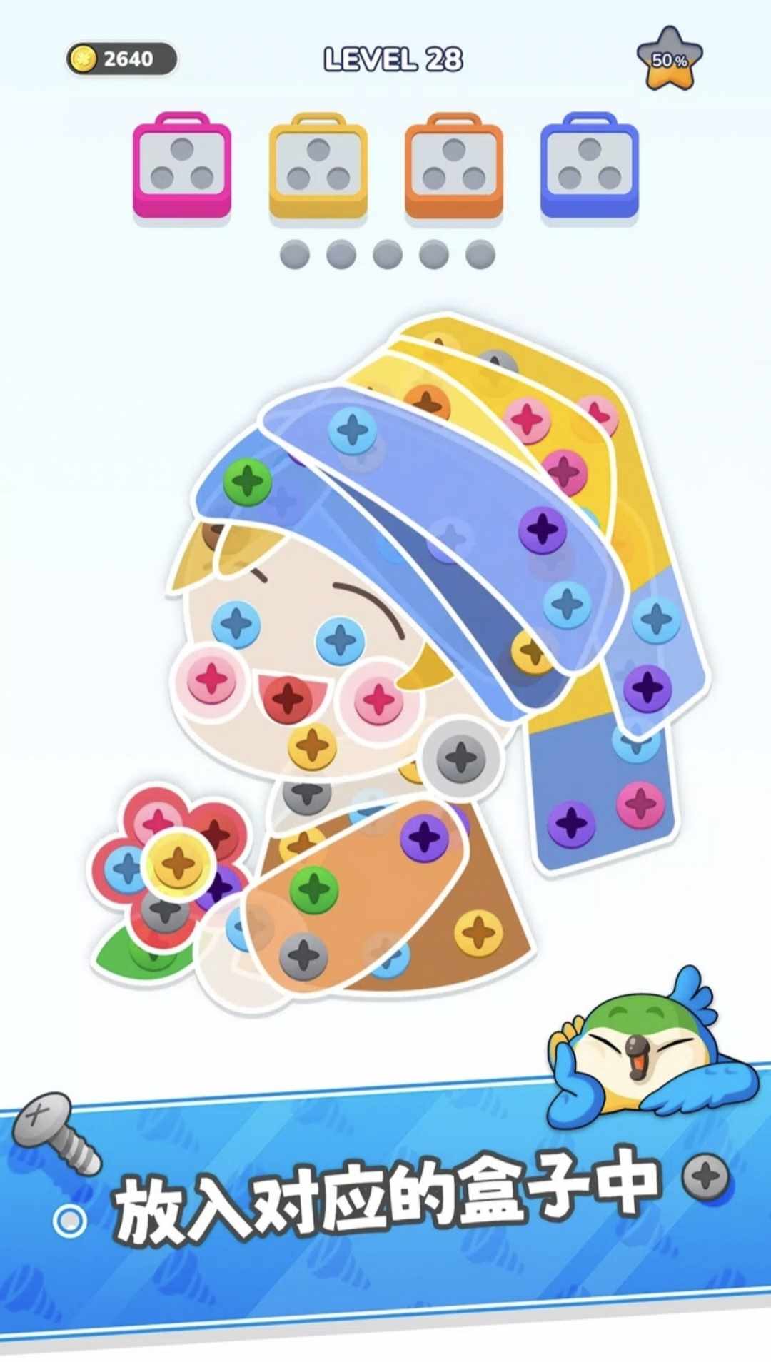 • 用相同颜色的螺丝填充每个螺丝盒;完成所有即可获胜。