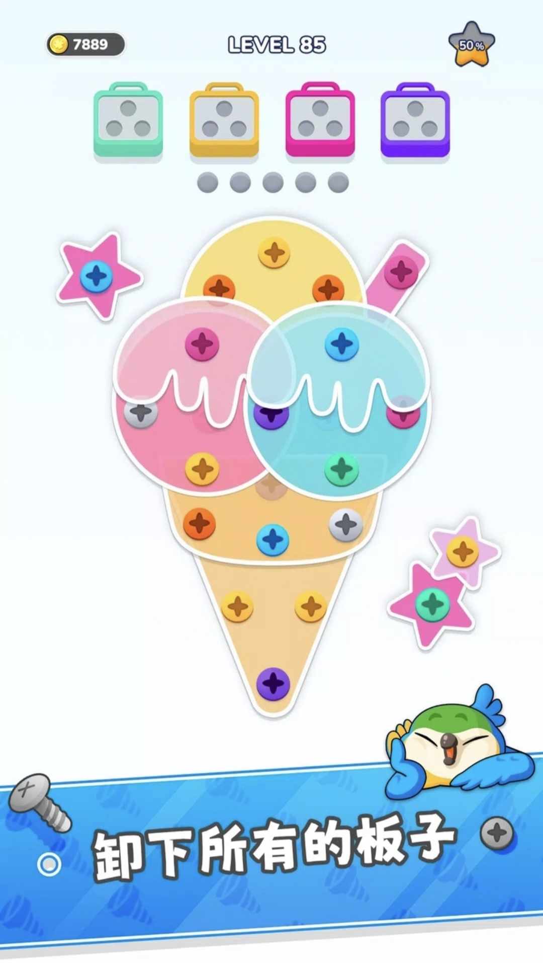 随着您的进步获得积分并解锁奖励,激励您有效地解决螺丝难题并获得更高的分数!