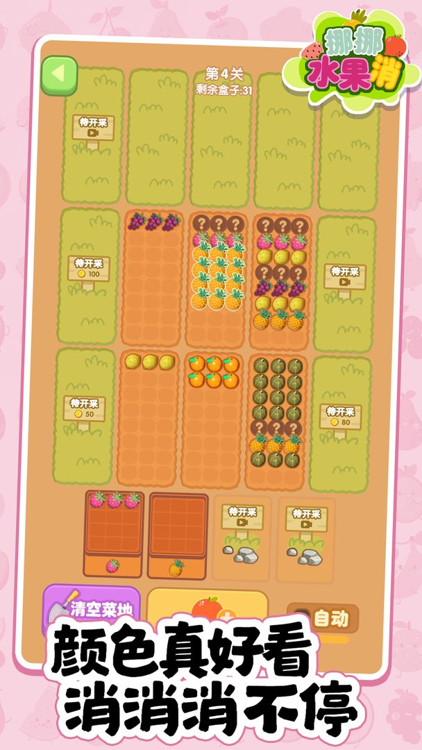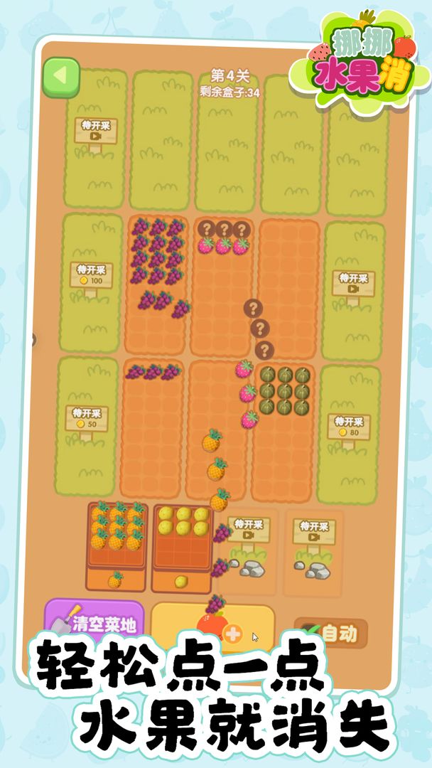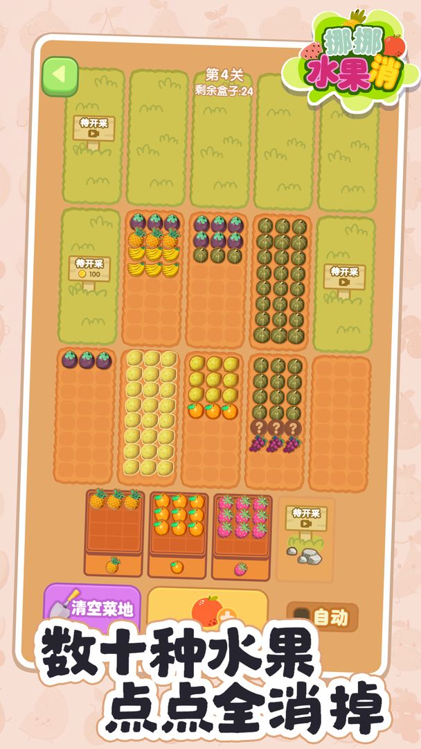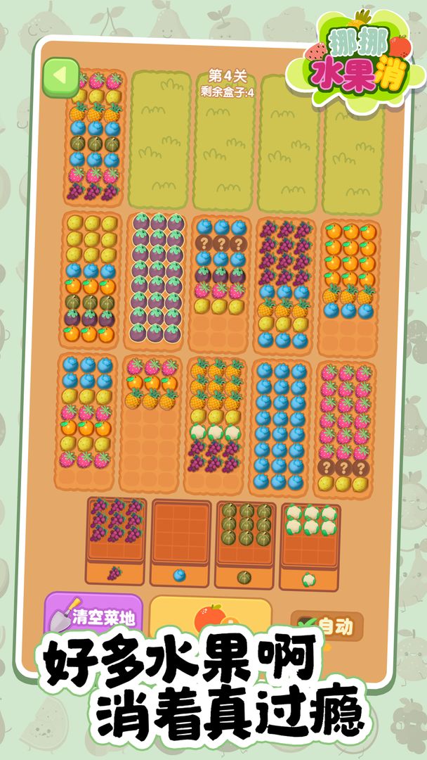 这是一款将蔬菜水果全卖掉的游戏!它不仅仅是一款简单的消除游戏,游戏里有好多颜色的水果,你只需要把相同颜色的水果叠在一起,叠到一定数量就可以换成金币啦!快来挪挪水果消,释放你的压力,展现你的技巧,成为真正的农场大亨!