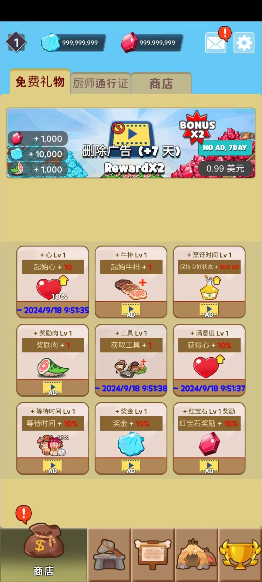 大量货币 & 免广告获得奖励