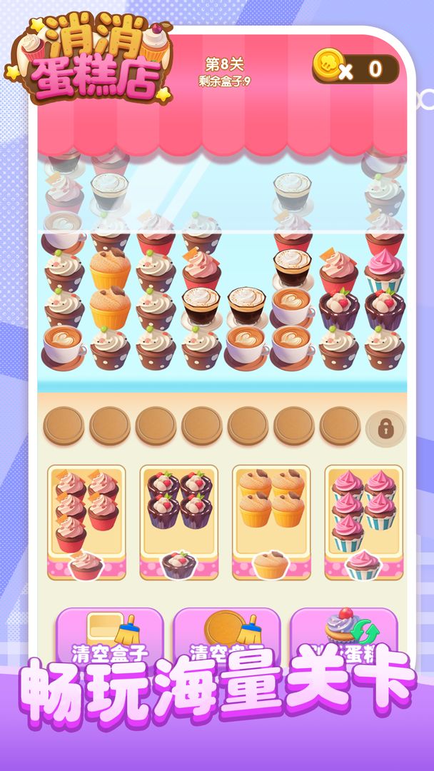 这是一款把蛋糕装满盒子的益智游戏,游戏方法为点击下层的蛋糕,按照盒子的需求把对应的蛋糕装满即可消除,满足顾客还可以获得金币,用来装扮自己的蛋糕店,快来挑战一下吧。