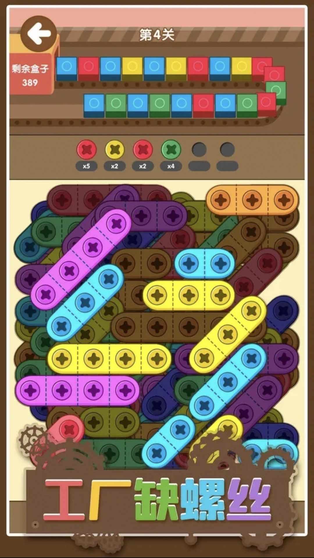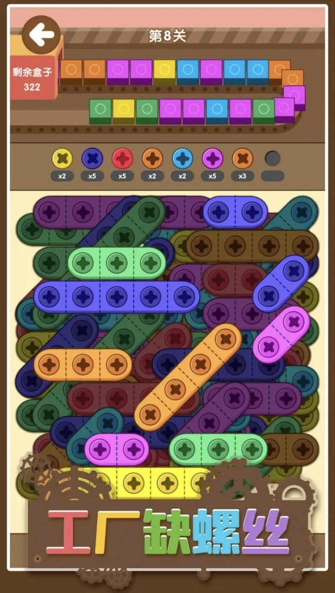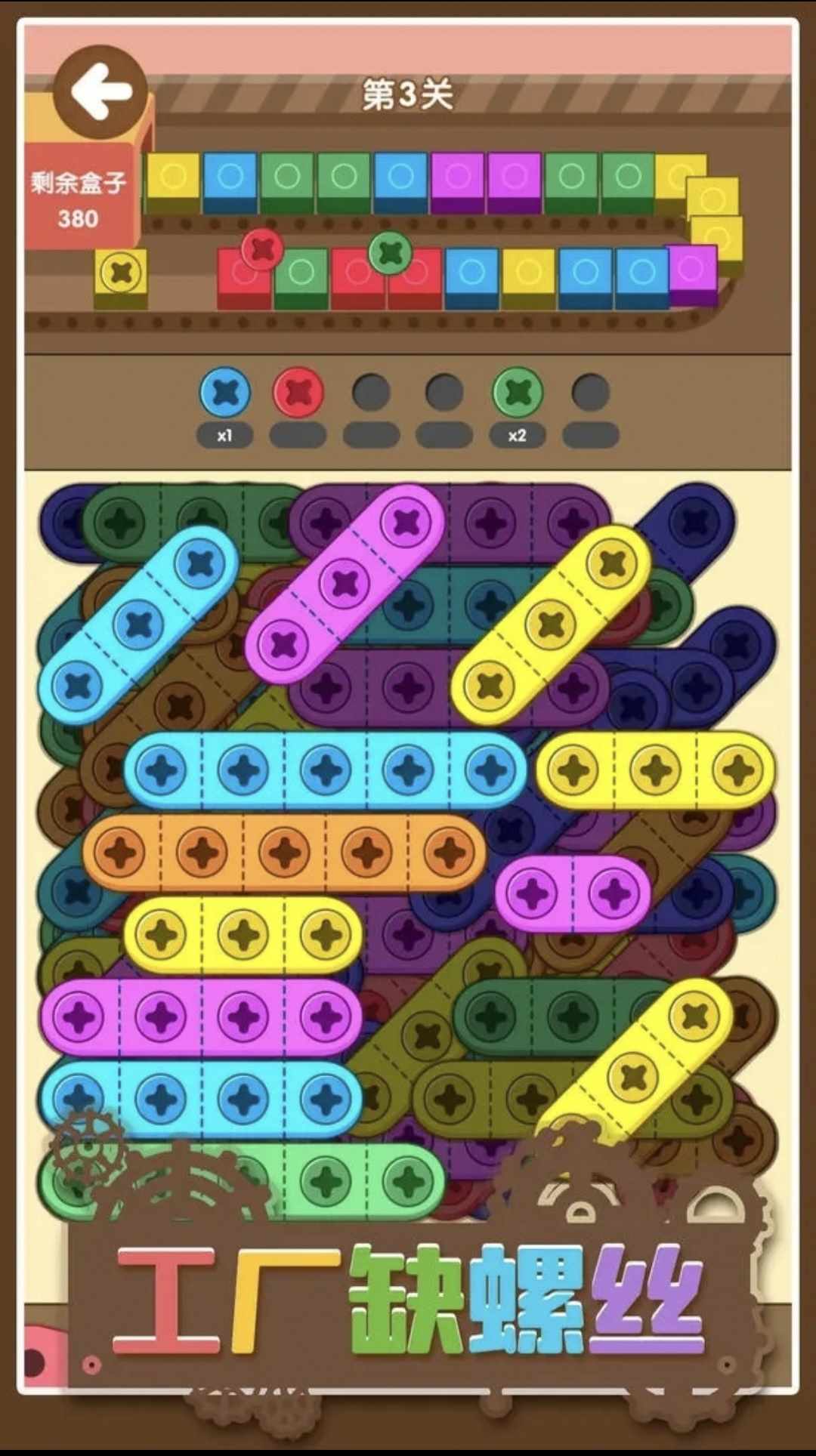 这是一款将螺丝拧到盒子上的益智游戏,游戏方法为点击板子上的螺丝,螺丝会全部被拧下来,再按照工厂流水线上的盒子的颜色拧上螺丝,即可完成盒子加工,全部加工完成即可过关。随着游戏的进行,螺丝颜色也会越来越多,快来挑战一下吧。