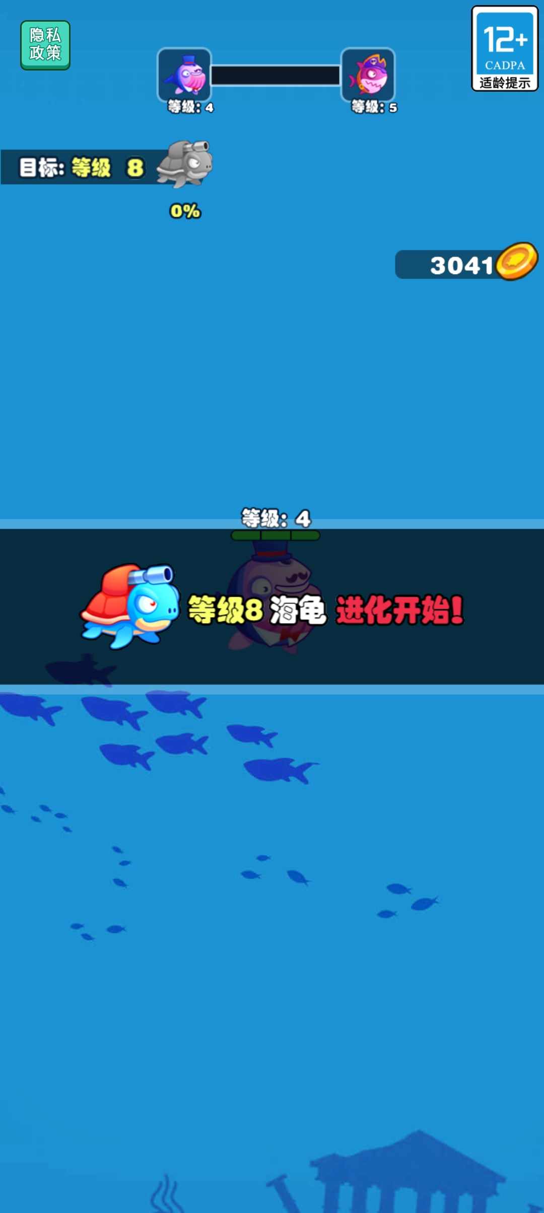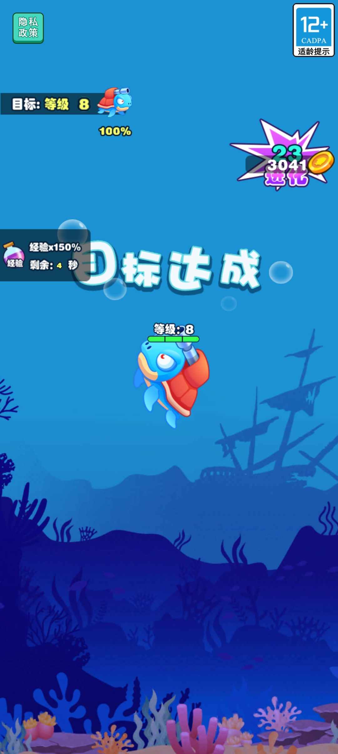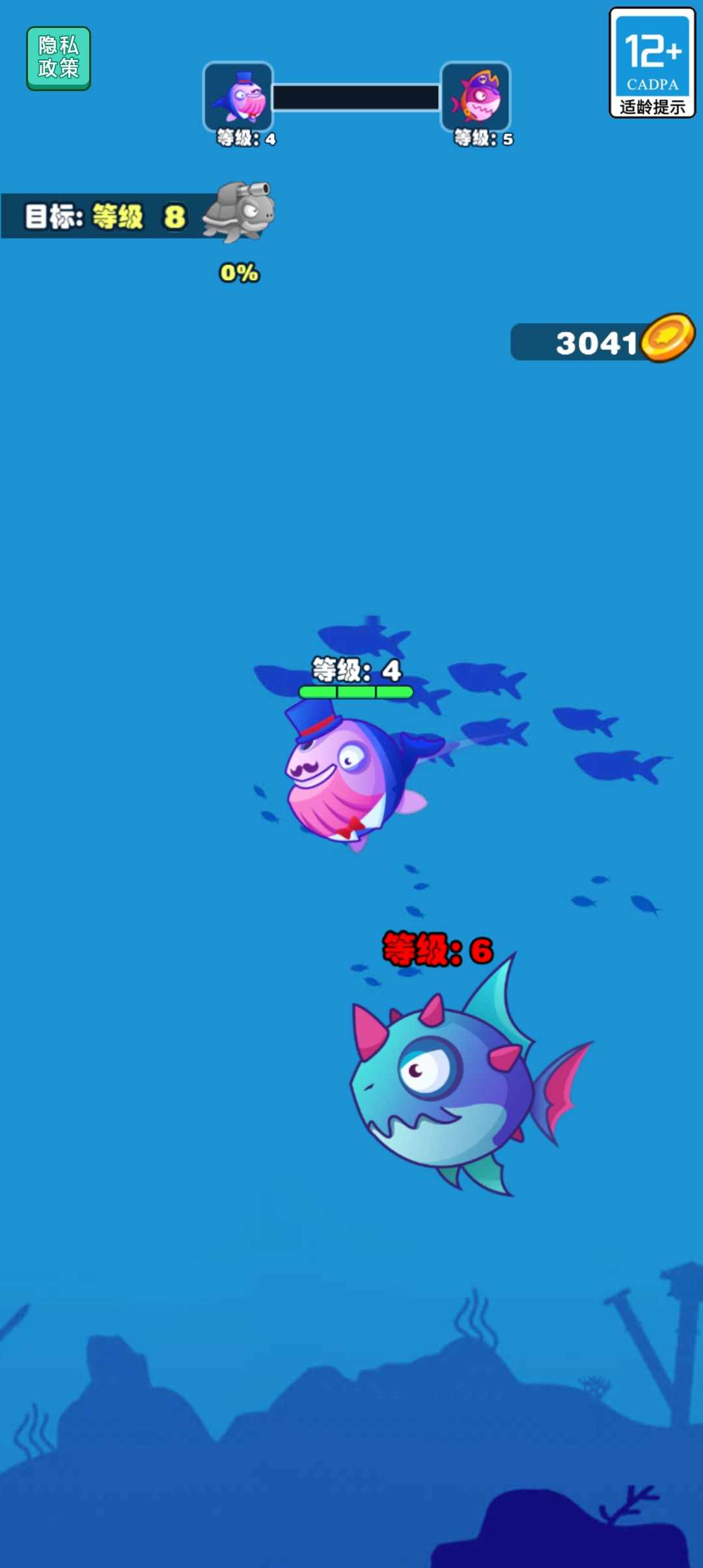 玩家控制一条小鱼吃鱼进化,只有和自身同等级或低等级的小鱼才能被吃掉,触碰高等级的小鱼会减少玩家的血量,游戏中还会出现回复血量,增加经验,炸弹等道具,注意灵活运用和躲避,当玩家达到关卡目标后获得游戏的胜利。