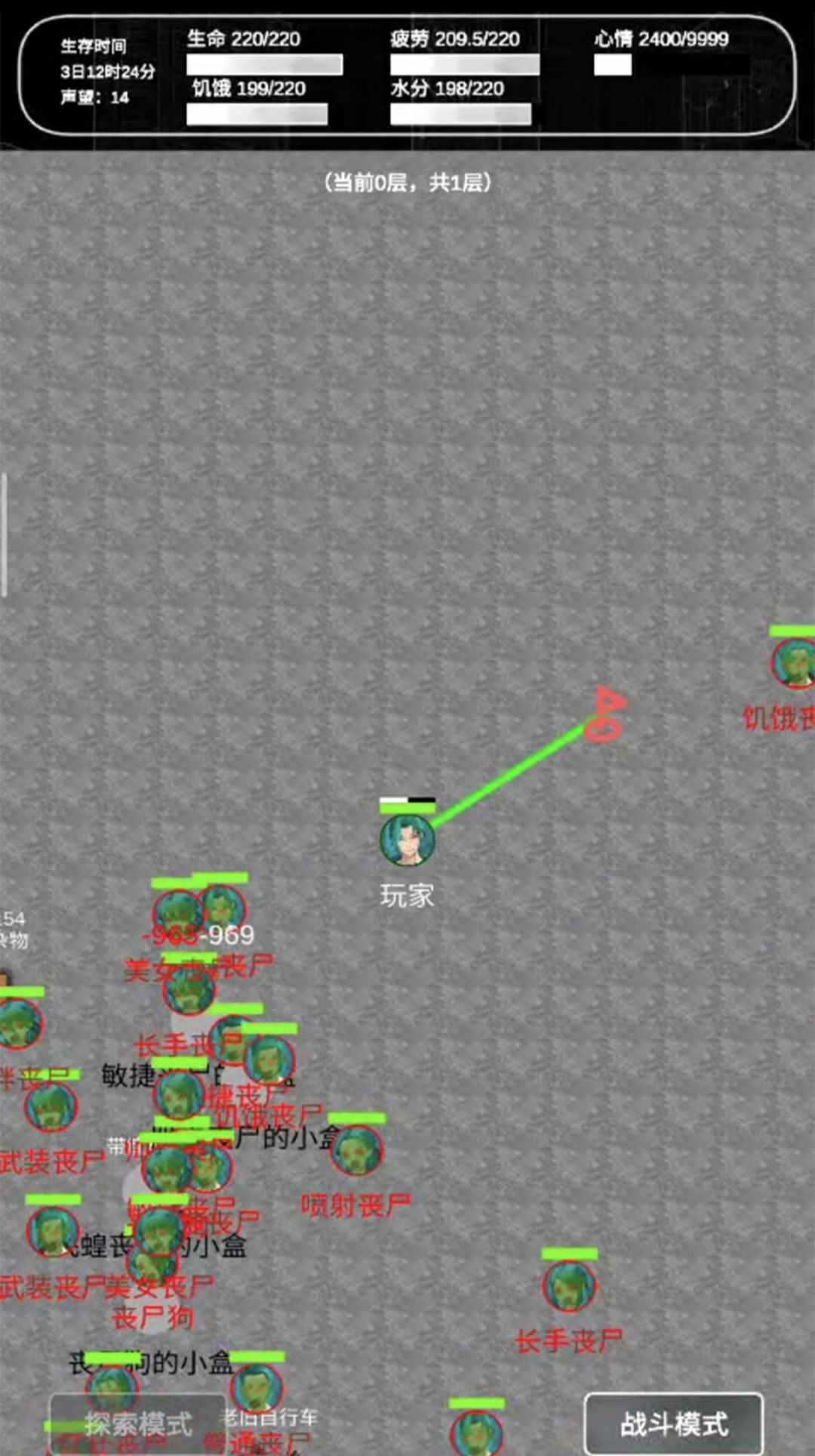 1.要记得吃饭喝水和休息,休息需要去找床或者椅子,一般民房里大概率会有,极度饥渴或者疲劳会慢慢扣血。
