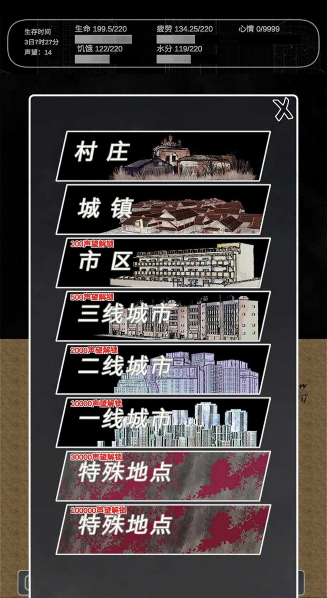 5.初始村庄搜索完毕之后,可前往道路尽头,再打开地图点击选择出发前往下一个城市,原村庄存档会保留,还可以常回来看看,前往其他城市的道路固定200格,每格的距离则要看前往的城市类型,越后期的城市需要的路程越长,大约都是一天的路程。