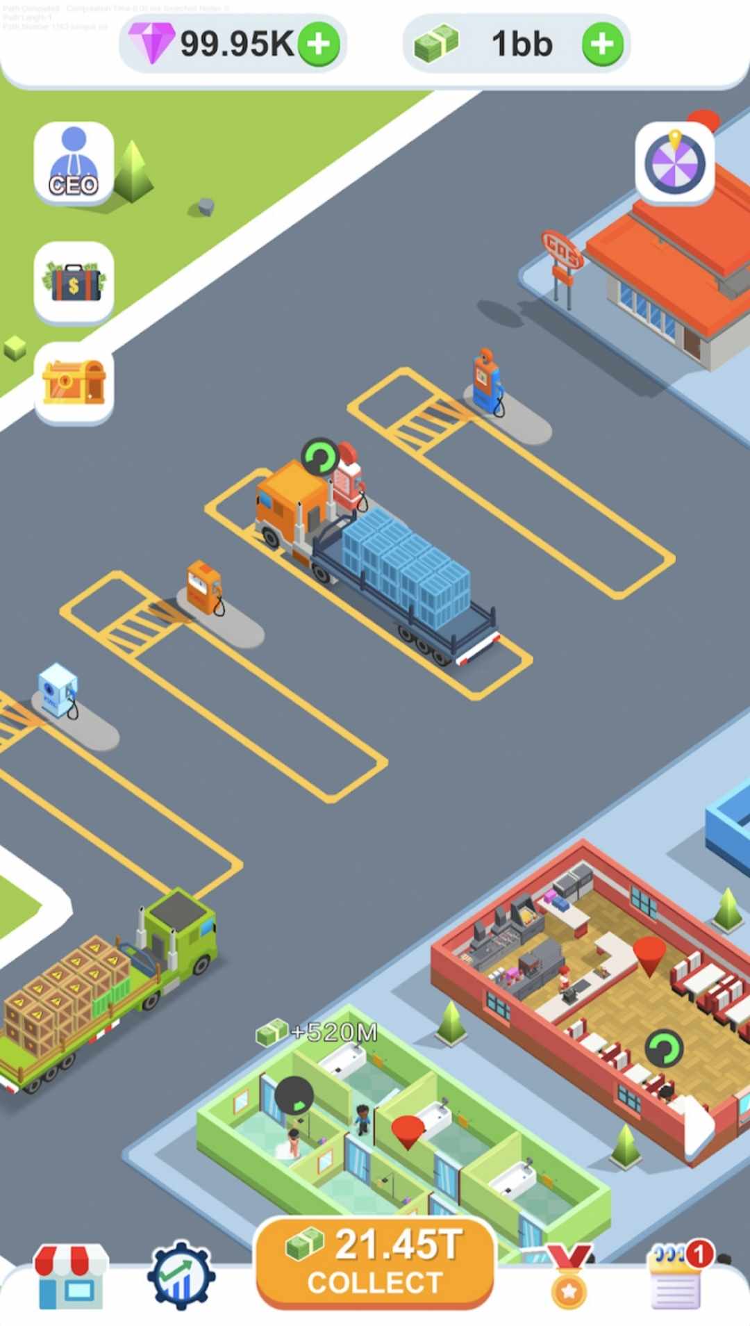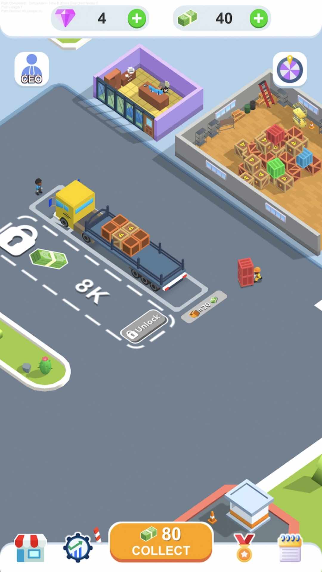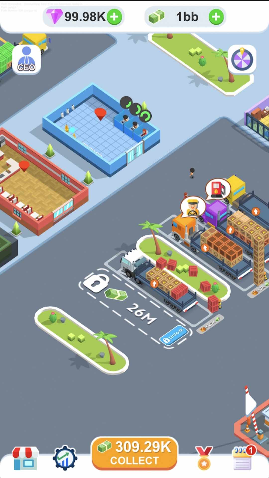 介绍卡车仓库,卡车管理的终极休闲闲置游戏!掌管自己的货运业务,并看着它蓬勃发展。解锁停车位并目睹卡车驶入。当司机下车时,为他们解锁洗手间。一旦松了一口气,他们将获得利润。然后,当您雇用工人将货物从仓库装载到卡车上时,司机在卡车旁等待。每个加载的物品都会产生收入。每辆卡车载有 20 件货物,货物逐渐堆积。装满后,司机登上卡车,腾出位置迎接新来的人。卡车开向加油区,在那里您可以解锁油泵。点击它来加油,需要 10 秒钟。一个满的坦克奖励你。解锁更多停车位、办公室(以雇用更多工人)、加油站、洗手间、餐馆(司机购买汉堡获利),甚至浴室(司机放松和赚钱)。在 Truck Depot 体验管理卡车帝国的乐趣!