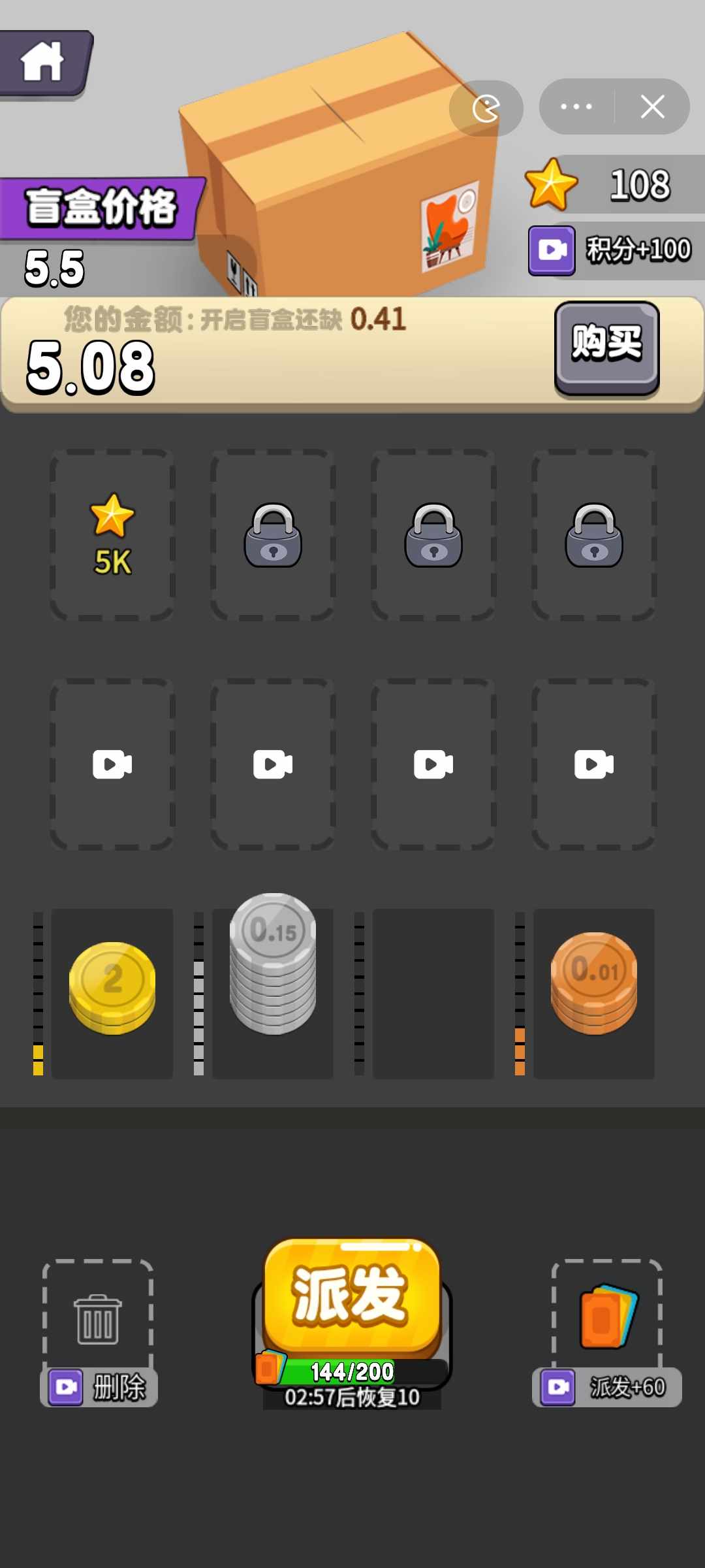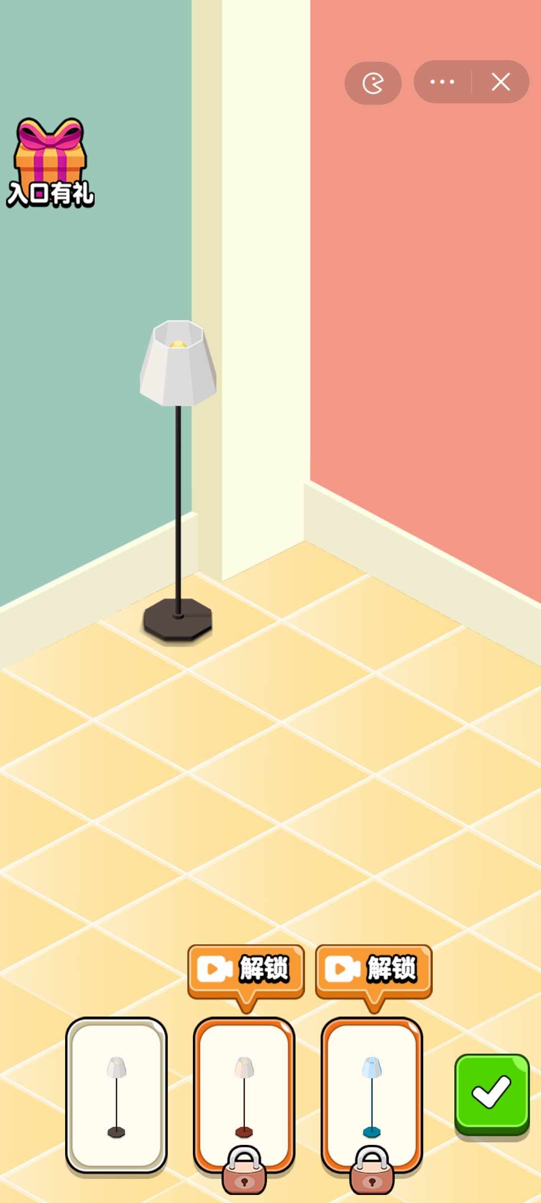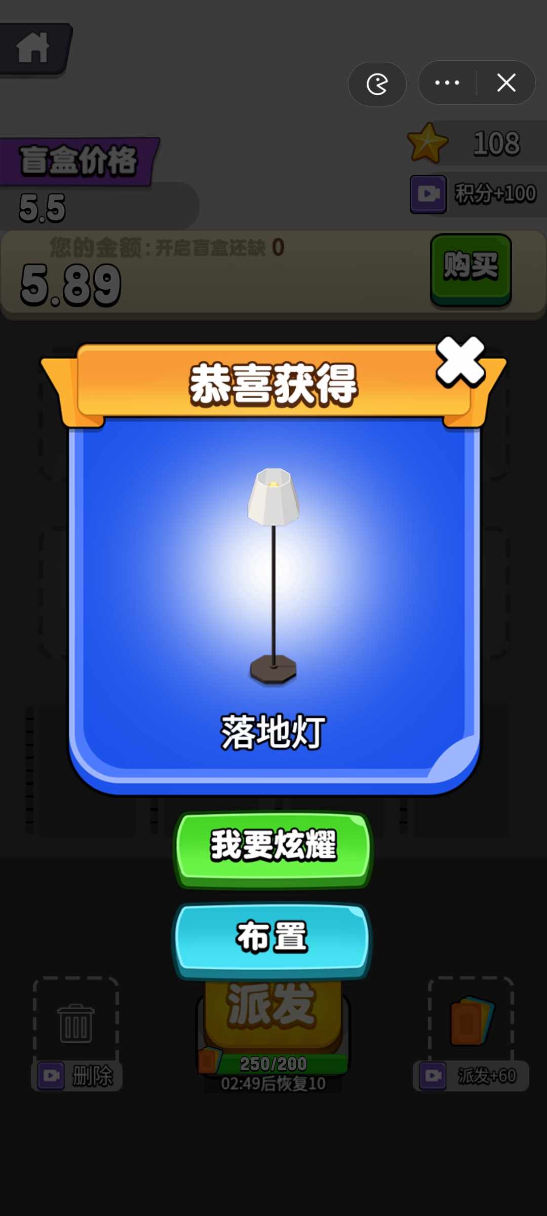 家庭装修玩法:每一个关卡都有盲盒完成每个关卡所需要的开箱金额后就可以获得啦,盲盒获得的家庭装饰为随机道具。可以在游戏内的房