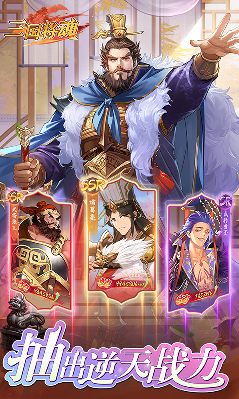 江山易改,美人多娇!全新热血三国卡牌手游《三国将魂》闪亮登场!在这里,与三国佳人来一场浪漫的邂逅,和传说豪杰武神们来一场痛快淋漓的厮杀,名器升星,获取无门槛,快速挂机,解放双手也能领取丰盛奖励,各种福利特权元宝拿到主公手软,Q版形象,华丽翅膀,多样场景主题幽会,解锁心跳加速的佳人衣裳,定制属于你的武将!快来攻打城池,征收世界,圆自己一个三国梦!