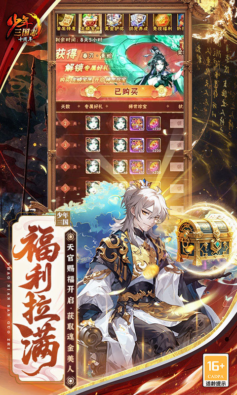 龙吟盛世,封神九州!《少年三国志》联手封神开启九周年旅程!少年踏上东渡之路,龙女赐福,共绘史诗篇章。主城焕然更新,神龙守护,每日任务丰厚奖励不断涌现。问卦寻宝,神秘礼盒等你拿!与众英雄共赴封神之战,携手救龙女,传奇之路由此铸就。尽情畅游,趣味活动不断,超值奖励轻松收入囊中!