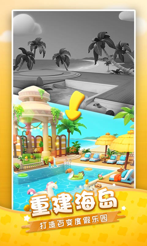 假日岛修复计划全面启动,一起来翻新遭到超强台风破坏的假日海岛吧!度假的乐趣远不止于阳光和沙滩,更在于亲手将这座迷人的海岛建造成你梦想中的度假胜地。享受畅爽解压的消除乐趣,打造百变海岛度假乐园。消一下,就放假!