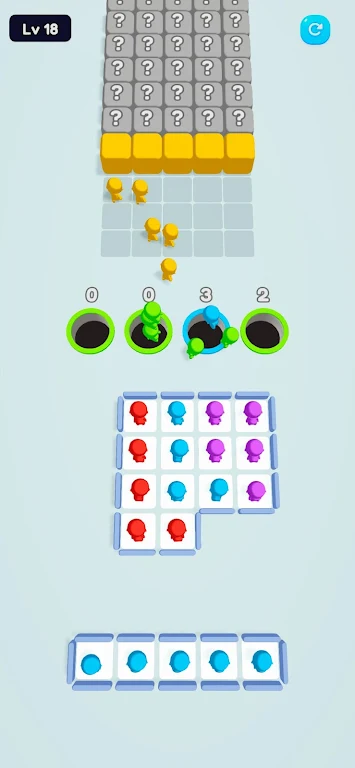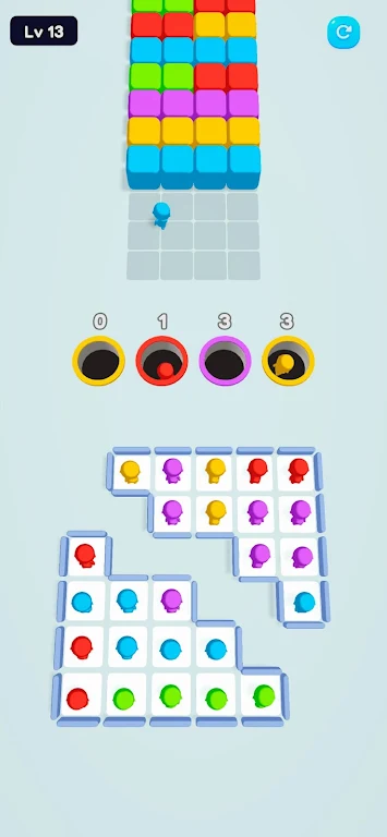 在“颜色匹配”中,匹配是成功的核心。如果角色在到达棋盘顶部时,找到了与其颜色相同的方块,他们便会顺利捡起这些方块。反之,如果角色未能找到合适的方块,他们将掉落到棋盘下方的洞里,等待下一个合适的颜色出现。这一机制增加了游戏的策略性,玩家需要仔细思考每一次移动。