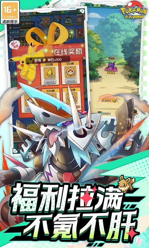 【培养】回合制限四招对战玩法,精灵mega进化、极巨化、神兽融合、限时狩猎等创新玩法。