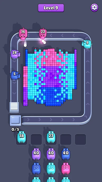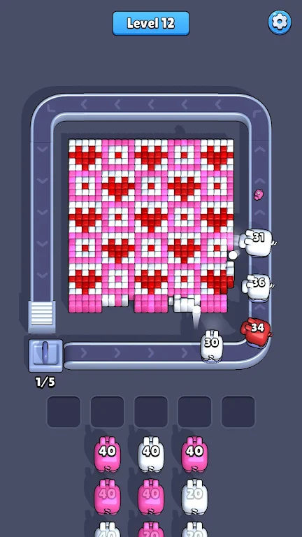 在《像素流》中,玩家将体验一场轻松而又充满挑战的游戏旅程。传送带上,猪猪们正静静等待着发射时刻,一旦你轻触这条传送带,猪猪便会迅速出击,朝着与自己颜色相同的像素方块发起攻击。每个猪猪的头顶都显示着其拥有的弹药数量,代表着它们能够击出的次数,玩家需要合理运用这些弹药,以清除棋盘中的颜色方块,完成各项挑战。