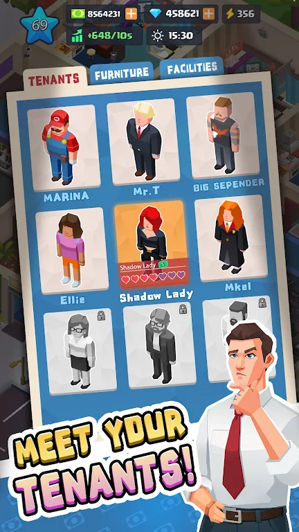 在《公寓大亨》中,玩家将享受到放置游戏的便捷性与深度战略管理的挑战性。通过轻触屏幕,玩家可以快速升级,自动收取租金,随时拓展和扩充自己的地产投资。为了最大化利润,玩家需要关注租户满意度,并根据市场需求优化物业配置。此外,现代化设施的引入,如健身房和屋顶花园,将为公寓增添吸引力,提升收入。