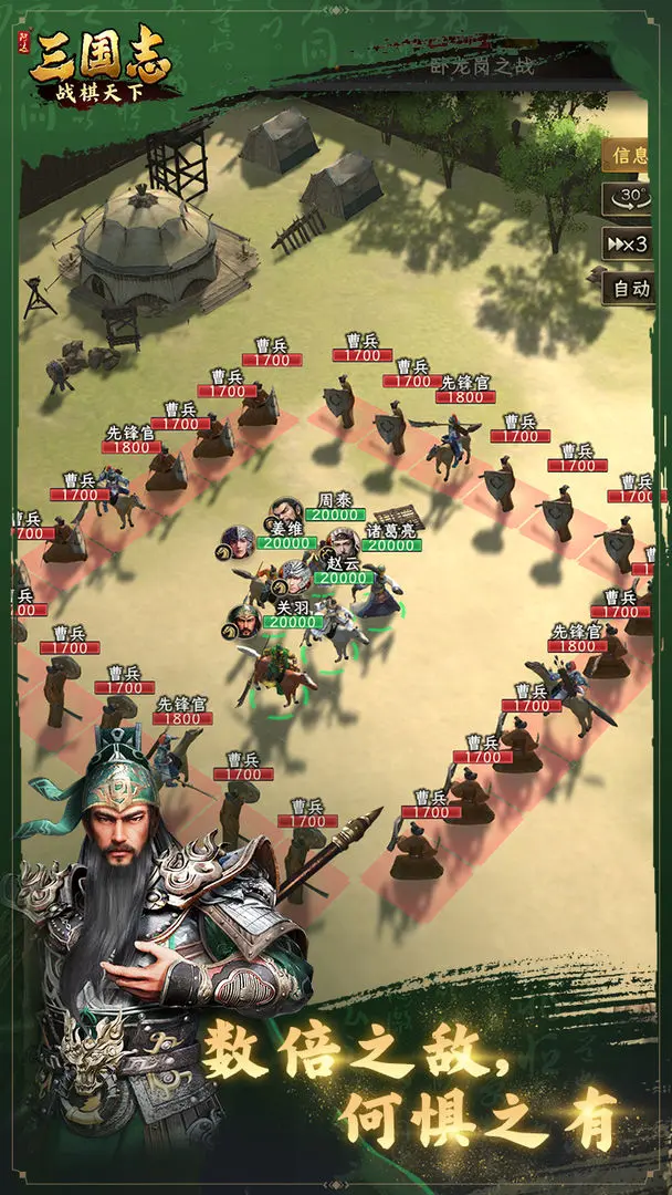 《三国志战棋天下》是一款基于经典三国历史背景的战棋策略SRPG游戏。在这个全新的游戏中,玩家将会欣赏到极具创意的关卡设计和战术玩法。你将扮演各路英雄,参与到著名的战役中,以高自由度的操作来制定应对策略,充分利用地形和兵种的特性,挑战各类敌人。
