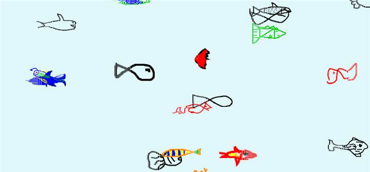 在赛博鱼缸中,玩家无需任何注册或登录手续,直接进入游戏便可开始创作。通过简单的绘画界面,玩家只需用鼠标或触控笔描绘出自己想象中的小鱼。一旦画出的鱼和系统内的鱼形态相似度达到60%以上,玩家就可以点击“make it swim”按钮,将自己的作品放入共享的鱼缸中,共同构建这个虚拟水域的生态。
