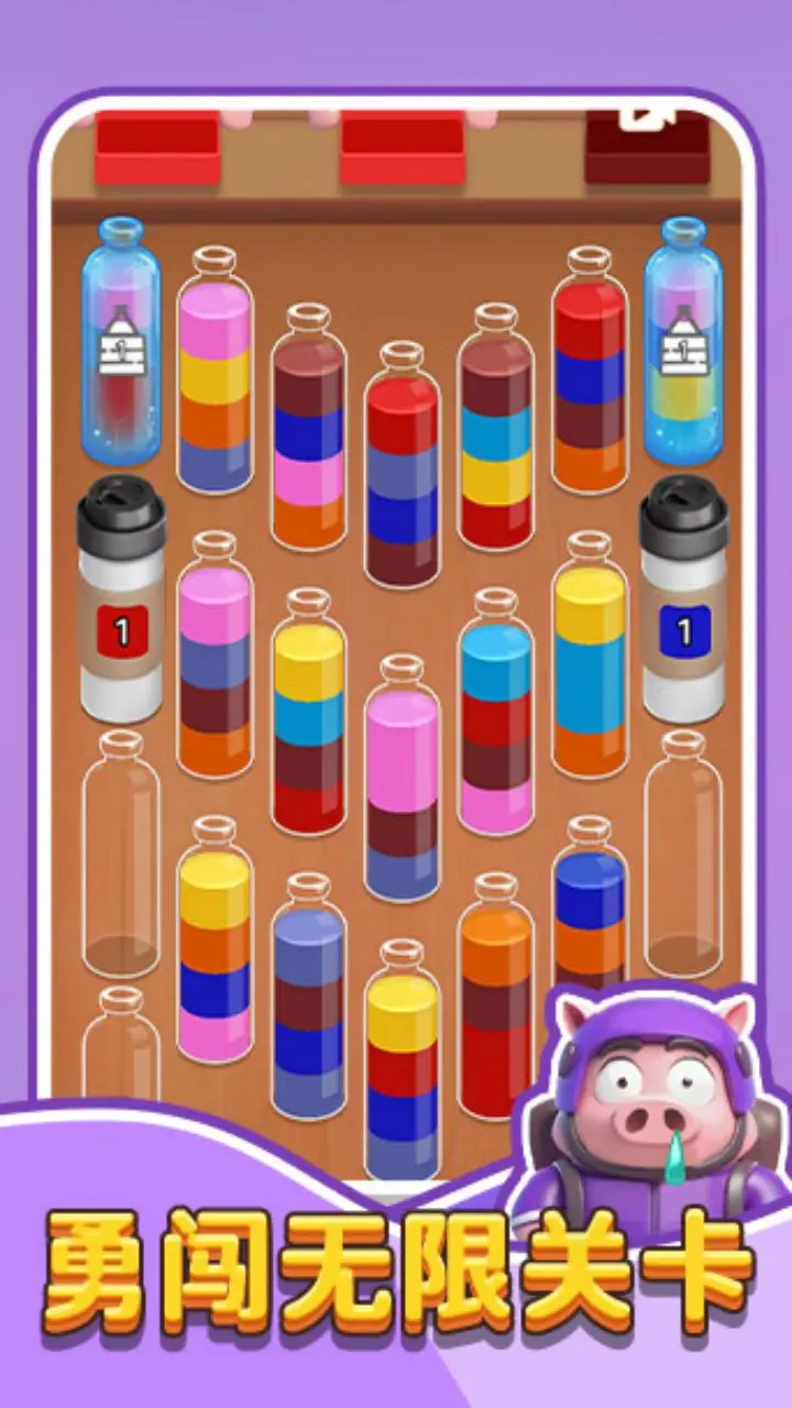 倒水挑战是一款能够锻炼玩家逻辑思维和规划能力的益智游戏。在这个充满色彩的世界中,你将面对多个不同颜色的瓶子,每个瓶子中装有各种颜色的液体。你的任务就是通过合理的倒水方式,将相同颜色的液体倒入同一个瓶子,完成这一挑战你需要动用智慧与策略。