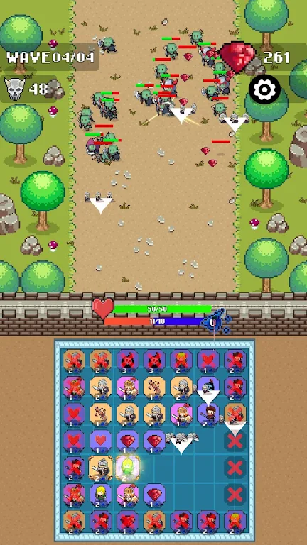 在每轮攻击之间,玩家可以使用获得的金币进行多种战略升级。通过提升士兵的等级,玩家可以增强攻击力和技能,使其在战斗中表现更加出色。同时,可以扩展游戏网格,从3x3升级到5x5,提供更多的匹配可能性和连击机会。提升法力容量或恢复速度也是一项关键策略,让玩家能够更加灵活地应对瞬息万变的战局。最大生命值的提升,同样是确保在困难波次中生存的必要措施。