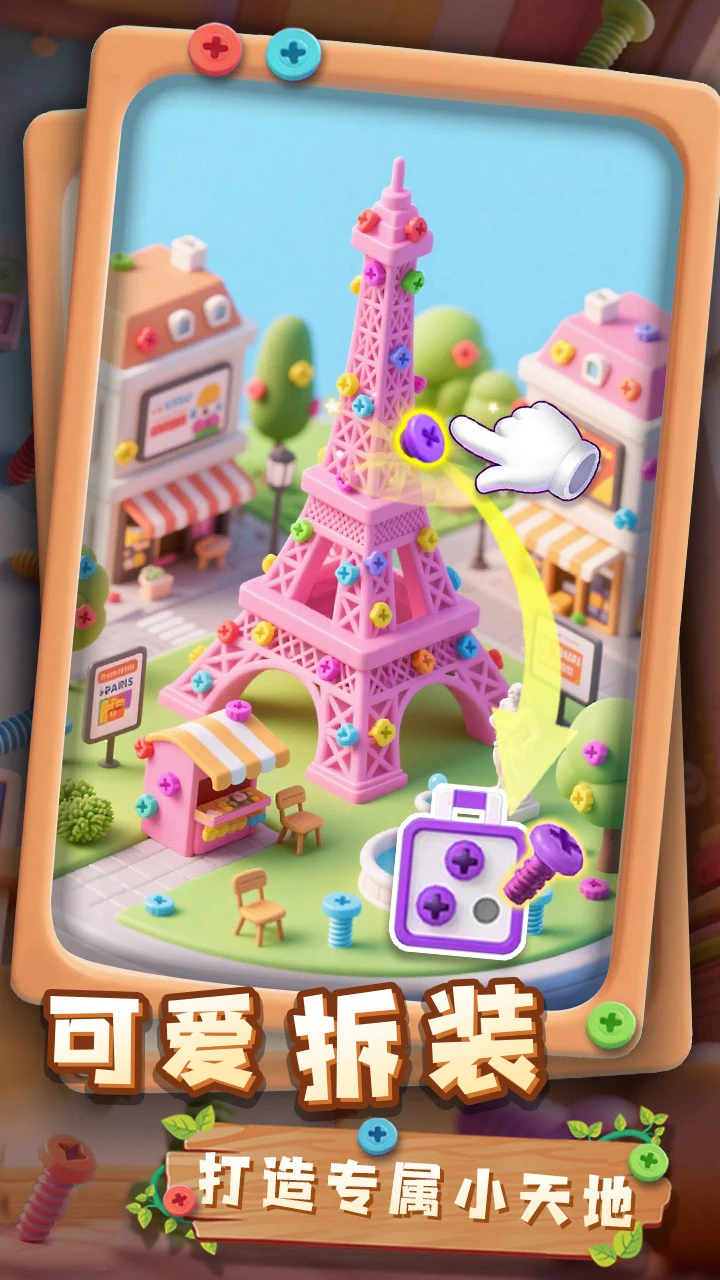 打螺丝乐园以其精美的画面和细腻的音效水准著称。游戏中的每一个小细节都经过精心打磨,从五光十色的零件到栩栩如生的场景,让玩家仿佛置身于一个充满奇想的缤纷世界。悦耳的音效为整个游戏增添了更多乐趣,无论是旋转螺丝还是拆解机械,都会给你带来真实的沉浸感。