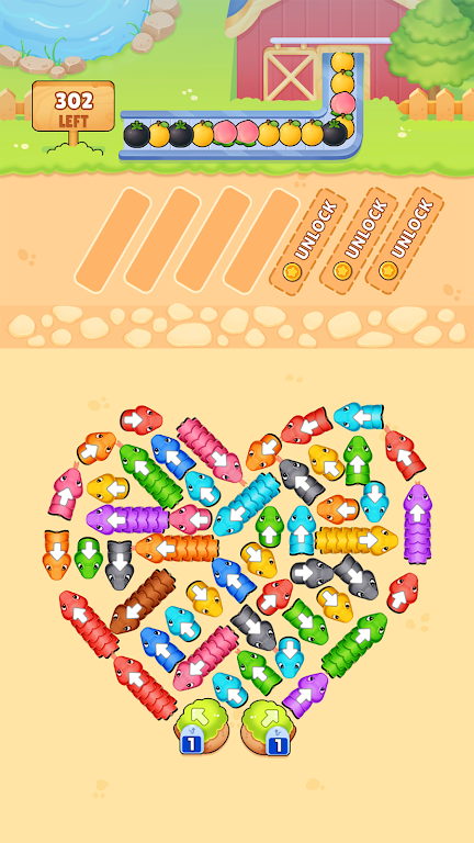 在“蛇出局”中,你的主要任务是帮助蛇清除路径中的障碍,避免造成交通堵塞。一旦你成功引导蛇避开危险,便可以使之滑行至安全地点,通过匹配相同颜色的水果,完成每一关卡。这种简单而富有挑战性的玩法,让你在享受游戏乐趣的同时,也能够锻炼自己的逻辑思维。