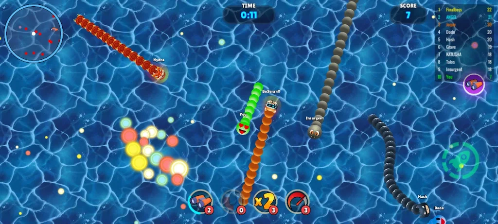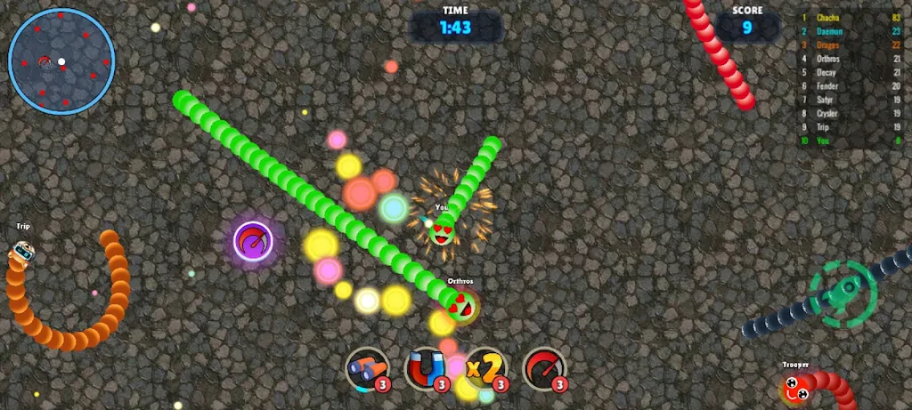 蛇之战:贪吃蛇游戏的魅力在于它提供了快速而激烈的多人对战模式。在这里,每一场战斗都是对你的反应能力和策略思维的考验。与来自全球的玩家实时竞技,展现你的技术,吞噬比你小的对手,让他们从竞技场上消失。务必保持警觉,因为在别人眼中,你也可能是猎物。