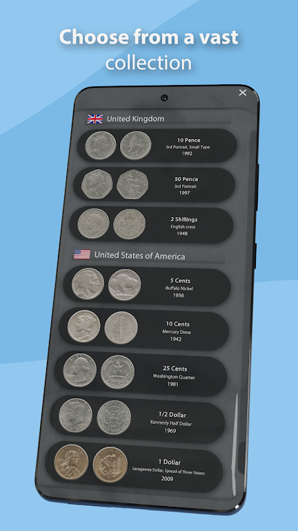 硬币模拟器提供了来自世界各地、不同历史时期的大量硬币收藏,用户可以根据个人喜好自由选择。无论是古罗马金币还是现代流通币,您都能在这里找到自己心仪的硬币。同时,本应用还允许您翻转虚拟比特币,这为数字货币的爱好者增加了一个创新的玩法。