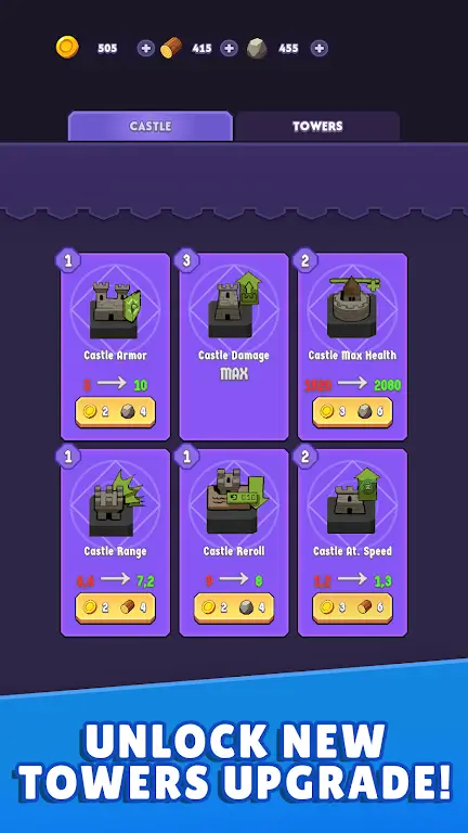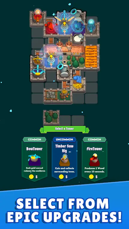 城堡的强大依赖于你的技能与决策。在游戏中,玩家可以建造和升级各式各样的防御塔。每种防御塔都有其独特的特性,可以通过提升伤害、射程、射速等属性来增强自己的防御能力。不仅如此,升级过程中也能解锁与众不同的协同效果,从而形成链式反应,让敌人难以突破防线。