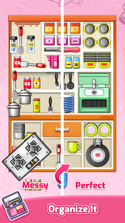 游戏中的场景丰富多样,包括厨房、浴室、卧室和化妆台等,带给你不同的整理体验。每个关卡都设置了独特的小挑战,让你不仅仅是在拖动物品,而是需要思考如何高效地进行整理。这些趣味关卡不仅增加了游戏的挑战性,也让你在轻松愉快中提升整理技能。