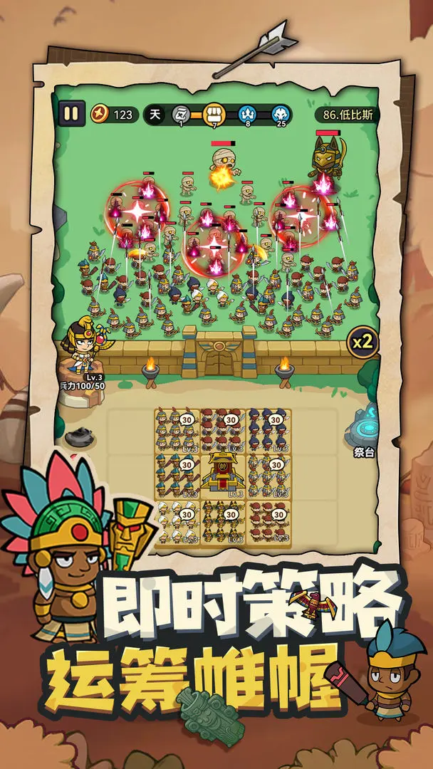 在这片辽阔的土地上,四大古国竞相争夺资源与领土,历史的车轮滚滚向前,冲突与战争成了每个国度的宿命。在《我有一计(测试)》中,玩家将深入其中,体验这场影响历史进程的史诗战争。古中国的铁骑、古埃及的战车、古玛雅的勇士和古罗马的军团将在这里相遇,每个文明都将在智慧与策略的较量中寻找胜利的机会。