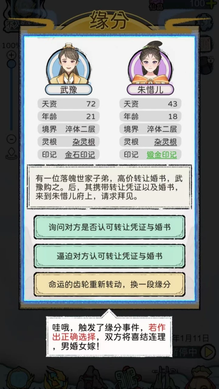 缘分是修仙路上不可或缺的元素。在《小小宗门养成记》中,您将有机会遇到各种各样的NPC,每个角色都有自己独特的背景和个性。通过与这些角色的互动,您可以培养深厚的情感,最终结成道侣。在这个过程中,玩家不仅需要完成特定的任务和挑战,还要通过选择合适的对话选项来推动剧情发展,为日后成为一对修真伴侣打下基础。
