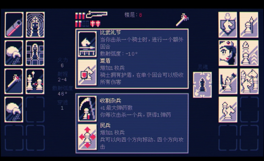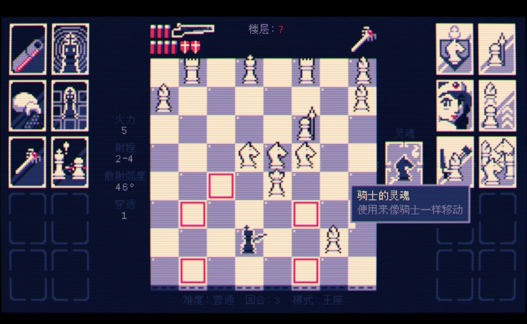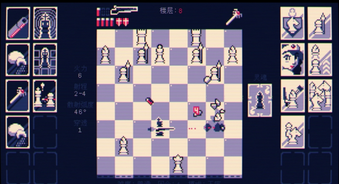 《霰弹国王:终局将死》是一款极简主义的回合制策略游戏,由经典的国际象棋机制重新构建而成,融入了Roguelike元素,展现了一个阴郁而富有挑战性的战斗世界。在这个游戏中,你化身为一位手握霰弹枪的孤胆国王,面对不断增多的敌方棋子,你需要制定策略,安排每一个步骤,力求在数不胜数的敌人中找到生存与反击的机会。