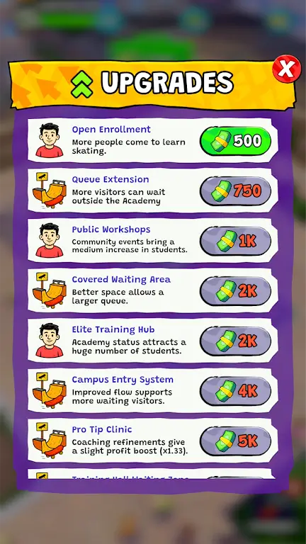 随着游戏的推进,你将看见自己的滑板学校由小型校园成长为城市中备受热爱的滑板热点。完成各种目标和任务,获取丰厚的奖励,逐步建立起一个充满生机的滑板王国。在这个过程中,城市的滑板文化也将随着你的努力而壮大,成为街头运动的活力中心。