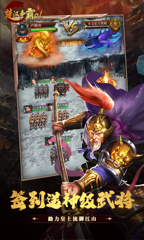 手游巅峰力作《楚汉争霸OL手游》战争游戏重磅来袭。全新热血策略卡牌对抗闯关游戏,武道至尊,群雄汇聚!玩家可以与游戏中近200位历史名将结识,带领武将抗击敌人,让敌人胆战心惊!全新的武将羁绊系统助玩家打造最强国家队。庇护百姓,守卫山河的重担,还需天命者的你来肩负!