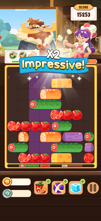 选择您心仪的厨师形象,例如拥有超强技能的神秘勺子塞莱斯特或闪电刀里昂,每位角色都具备独特的技能,能够帮助您在比赛中占据优势。您可以利用“过热”、“神之切片”和“冰冻”等强力道具,轻松清理棋盘,并创造出惊人的连击效果,让每一次的烹饪战斗更加精彩纷呈。