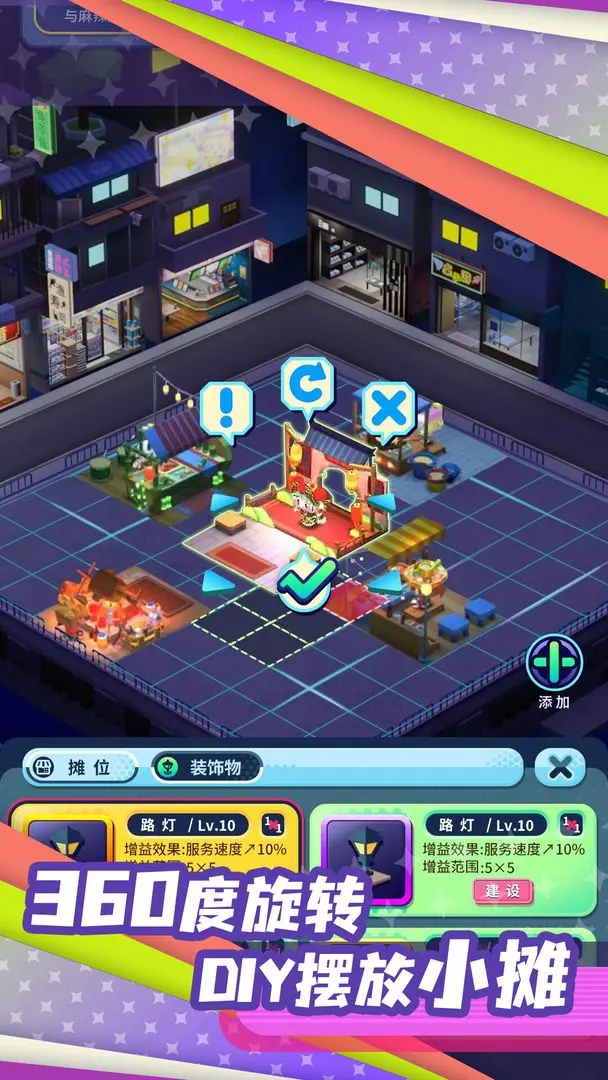 “代号:夜市”最吸引人的地方,无疑是其真实的3D自由摊位摆放。玩家可以按照自己的喜好,自由旋转摊位的位置,DIY打造出独一无二的夜市布局。在这个过程中,你的创造力将被充分激发,每个细节都能展现你对美的理解与追求。无论是摊位的形状、颜色,还是排列的方式,都尽显玩家个性,让每一个夜市都成为与众不同的艺术品。