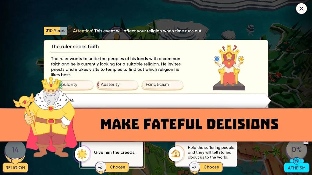 游戏中设置了众多动态事件与挑战,您需要在历史的长河中应对各种时代、地区的变化。这些变化可能包括战争、饥荒、科技进步等,应对这些挑战将测试您的领导能力和智慧。在不同历史节点的决策,将直接影响教义的传播方向和力量。