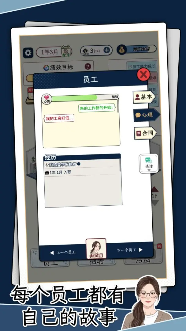 游戏中刻画的人物形象生动而真实,从初入职场的新鲜人到经验丰富的老鸟,每个员工背后都有不为人知的故事与性格。玩家将面临各种突发事件,比如员工间的冲突、优秀员工遭到竞争对手挖角,甚至可能会发生办公室恋情等复杂人际关系。这些事件不仅关系到员工的个人成长,也可能影响整体团队的气氛与公司发展,处理这些事件需要睿智而富有同理心的应对策略。