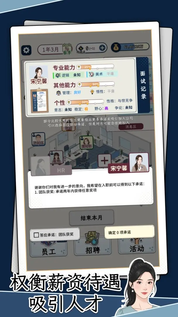 游戏的核心之一是招聘环节。在海量简历中,玩家需要展现出超乎寻常的洞察力,识别那些具备真正潜力与能力的候选人。在每一场面试中,玩家不仅要提出尖锐的问题,挖掘面试者的真才实学,还要通过细腻的心理博弈,了解他们的个性以及适应团队的能力。合理的评估方法可以帮助你过滤掉那些只会在表面上华丽包装自己的应聘者,为公司引进最具潜力的人才。