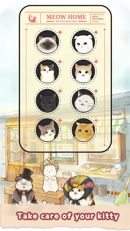 在喵呜小镇,猫咪们会在你每天的探访中,与之建立情感联系。每天一到两次,当猫咪们感到孤单或需要与人交流时,它们会主动找你聊天,或者给你留便条。有时,当猫咪们渴望出去散步时,你可以带它们探索小镇的美丽景色。同时,猫咪也跟人类一样可能会生病,你需要及时为它们准备医疗用品,帮助它们恢复健康。