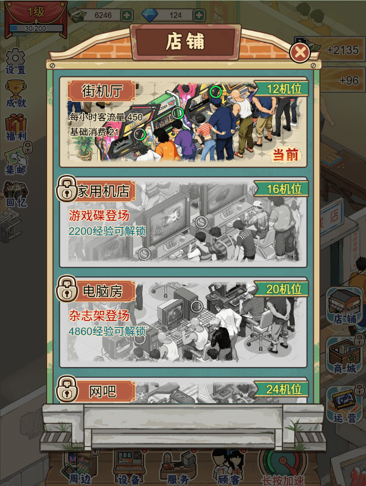 想要让小店被更多人知晓,得花心思优化经营策略。用赚来的第一笔钱升级街机设备,让机器运行更流畅,减少卡币故障;引入稀缺的游戏卡带与光盘,吸引资深玩家慕名而来;解锁特殊顾客剧情,比如帮常客找到童年回忆里的老游戏,就能收获专属奖励与口碑传播。随着收益逐年增加,可翻新店铺格局,扩大经营面积,添置更多游戏机与休闲设施,从狭窄的小巷铺子,逐渐升级成宽敞明亮的综合性游戏厅。每一次设施升级、每一位新顾客的到来,都在见证着这间游戏店的成长,也在续写着属于胖哥与老板娘的经营故事。