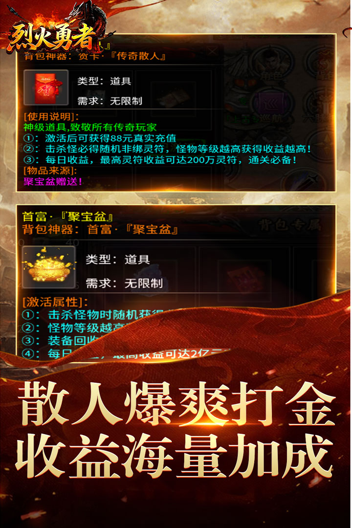 在《烈火勇者》中,所有的怪物都不再是简单的战斗对象,而是潜在的财富来源。万物皆可爆的设定让每一场战斗都成为收获的机会。无论是逆袭的百宝箱,还是神秘的宠物蛋,甚至是日常击杀的怪物,随时都有可能带来意想不到的惊喜。幸运的玩家将会在最紧张的时刻获得丰厚的奖励,实力与运气的完美结合,使得每一位玩家的体验都独具特色。